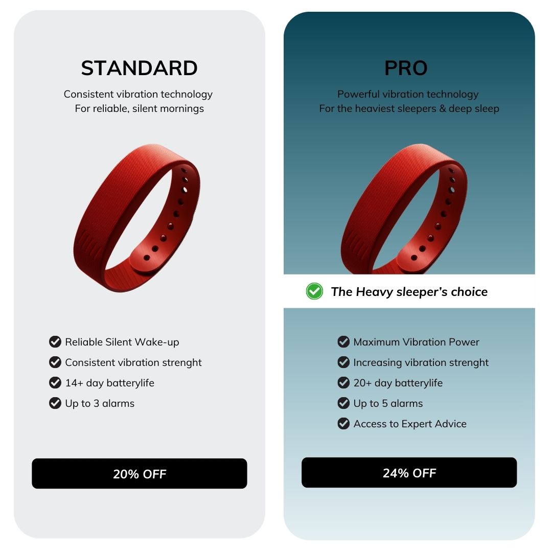 The Standard version uses a strong, consistent vibration that wakes most sleepers, while the Pro version is engineered specifically for extremely deep sleepers.