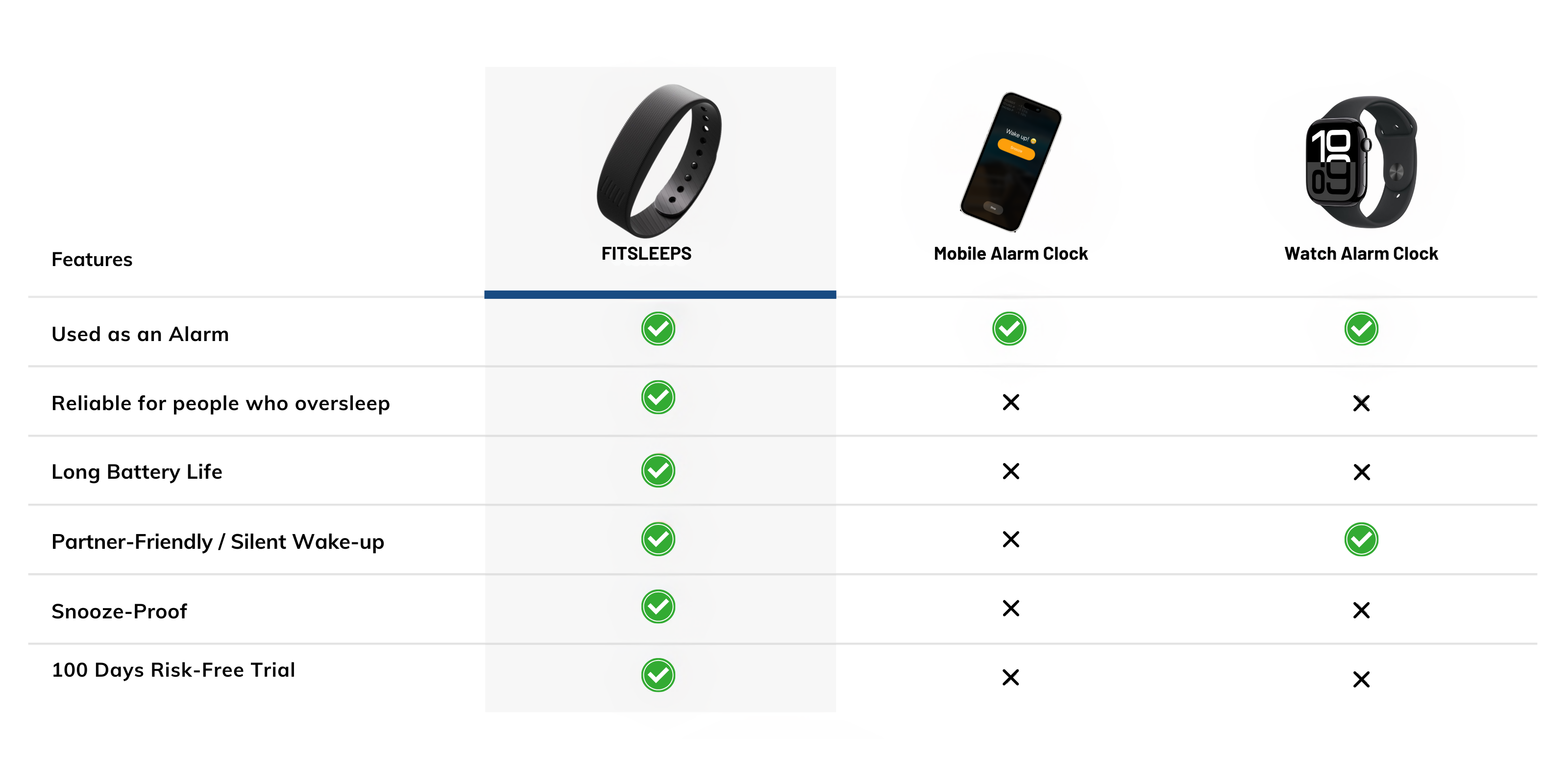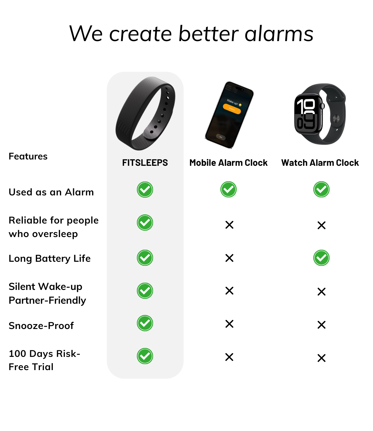 Geluidwekkers, analoge klokken en wake-up lights werken niet altijd. De FitSleeper biedt een betrouwbaar alternatief: trillingen die je écht wakker maken. - Voor wie vaak te laat wakker wordt of te vaak op snooze drukt.